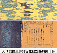 中國抗癌協(xié)會(huì)常務(wù)理事、河南省抗癌協(xié)會(huì)會(huì)長(zhǎng)楊文獻(xiàn)教授和《百花散》傳人梅先生合影中國抗癌協(xié)會(huì)常務(wù)理事、河南省抗癌協(xié)會(huì)會(huì)長(zhǎng)楊文獻(xiàn)教授和《百花散》傳人梅先生合影 據(jù)梅氏族譜記載,明末清初年間天臺(tái)縣深山有梅氏長(zhǎng)者為當(dāng)?shù)夭菟幚芍校谏钌讲伤帟r(shí),偶然進(jìn)入人跡罕至的深澗,澗中飛瀑從天而降,懸崖峭壁環(huán)繞,古樹參天,奇花異草,蝶舞蜂飛,巖壁長(zhǎng)滿靈蘭(鐵皮石斛仙人草)。深澗山洞中,有一石棺,棺中著明代服飾的白須老者栩栩如生,衣著完好;石桌有明朝正德年間治病強(qiáng)身《百花散》手抄醫(yī)書及白絹一幅,上有消化道腸胃、鼓漲病(肝腹水)、風(fēng)濕關(guān)節(jié)等疾病配制方法。先人獲此神書神方,后依方所示,采澗中峭壁上之靈蘭、三七、猴頭菇和麝香等奇花異珍配制成不同系列的《百花散》,治療山民常見的消化道腸胃疾病、鼓漲病(肝腹水)、風(fēng)濕關(guān)節(jié)疾病有奇效。山民食之,有病治病,無病健身。當(dāng)?shù)厣矫穸嚅L(zhǎng)壽,童顏鶴發(fā)、身體強(qiáng)健的百歲老人隨處可見,均得益于神方《百花散》。當(dāng)?shù)孛癖娍诒鄠,美譽(yù)百花散為'神藥'、'藥王'。先人由此名聲大振,驚動(dòng)大清朝庭,乾隆年間,皇帝多次下旨招先祖入朝并封賜。