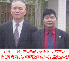 《百花散》傳人梅先生與中共臺(tái)州市委書記陳奕君同志合影紀(jì)念2018年7月《百花散》傳人梅先生與中共臺(tái)州市委書記陳奕君同志合影紀(jì)念2018年7月      天臺(tái)山古代中醫(yī)食療植物方梅氏《百花散》開發(fā)十年以來,已經(jīng)使各類胃腸疾病患者及肝硬化腹水病人數(shù)萬人(包括胃病變、腸病變、食道病變、肝病變患者)恢復(fù)健康,得到廣大患者一致好評(píng),并在康復(fù)患者中發(fā)展了數(shù)百名愛心使者擔(dān)任各地代理,為病痛患者服務(wù)引起社會(huì)強(qiáng)烈反響。古代傳世植物食療方《百花散》系列產(chǎn)品對(duì)胃病變、腸病變、食道病變、肝病變有神奇康復(fù)效果,已使眾多的重癥患者得到有效食療并康復(fù)。這一消息不脛而走,引起了河南省抗癌協(xié)會(huì)、河南省保健品協(xié)會(huì)、鄭州市腫瘤康復(fù)協(xié)會(huì)相關(guān)專家教授的高度重視,被禪醫(yī)武著稱的少林寺藥局局長(zhǎng)釋延琳大法師和中國道教協(xié)會(huì)副會(huì)長(zhǎng)、江西龍虎山天師府張金濤天師稱為中華民族之瑰寶,并得到社會(huì)各界人士和媒體關(guān)注。